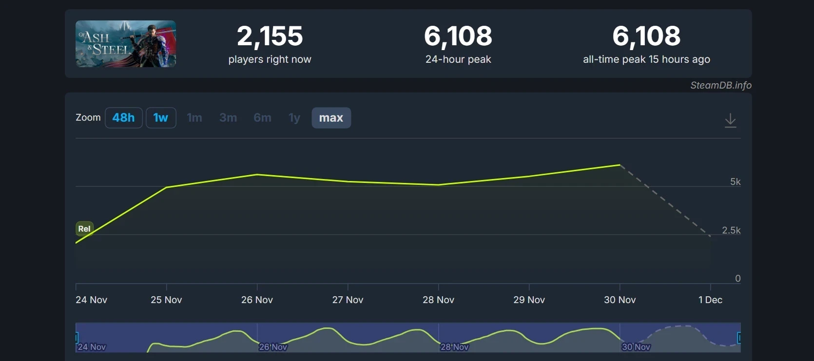 Обложка: скриншот Of Ash and SteelРусская ролевая игра Of Ash and Steel обновила свой рекорд пикового онлайна в Steam. Вечером 30 ноября он составил 6108 человек. До этого суточный рекорд слегка превысил отметку в 5,6 тысячи игроков, которые проводили время в RPG 26 ноября. При этом релиз новинки состоялся 24 ноября — сарафанное радио и хвалебные отзывы сделали своё дело.