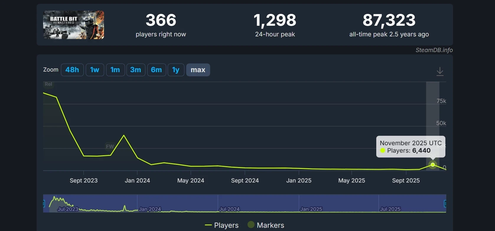29 ноября в BattleBit Remastered провели первый открытый тест обновления Operation Overhaul. Он длился всего четыре часа и привлёк свыше 6,4 тысячи игроков. В последний раз показатели выше наблюдались лишь весной 2024 года (8,5 тыс. игроков), в декабре 2023 года во время недели бесплатного доступа (почти 40 тыс. игроков) и на релизе. Вскоре после выхода 15 июня 2023 года кубический шутер собрал более 87 тысяч геймеров на пике.