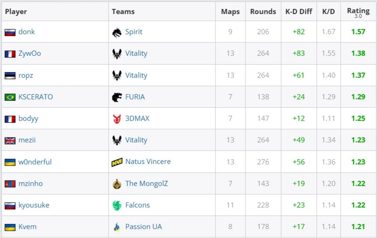 Ближайшим преследователем Крышковца стал снайпер Team Vitality Матье «ZywOo» Эрбо. Француз отстал от лидера на 0,19 пункта, однако провел на сервере на четыре карты больше. В итоге именно ZywOo был признан MVP турнира благодаря победе своей команды в гранд-финале.