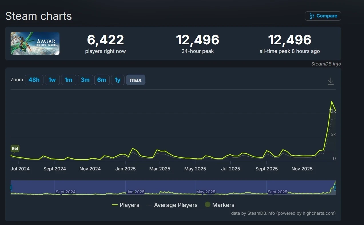 Avatar: Frontiers of Pandora обновила свой пиковый онлайн на фоне недавнего выхода дополнения «Из пепла» и обновления с видом от третьего лица. На достижение определенно повлиял и ажиотаж вокруг нового фильма Джеймса Кэмерона, «Аватар: Огонь и пепел». Кроме того, саму игру сейчас продают со скидкой 33% в рамках Зимней распродажи в Steam.