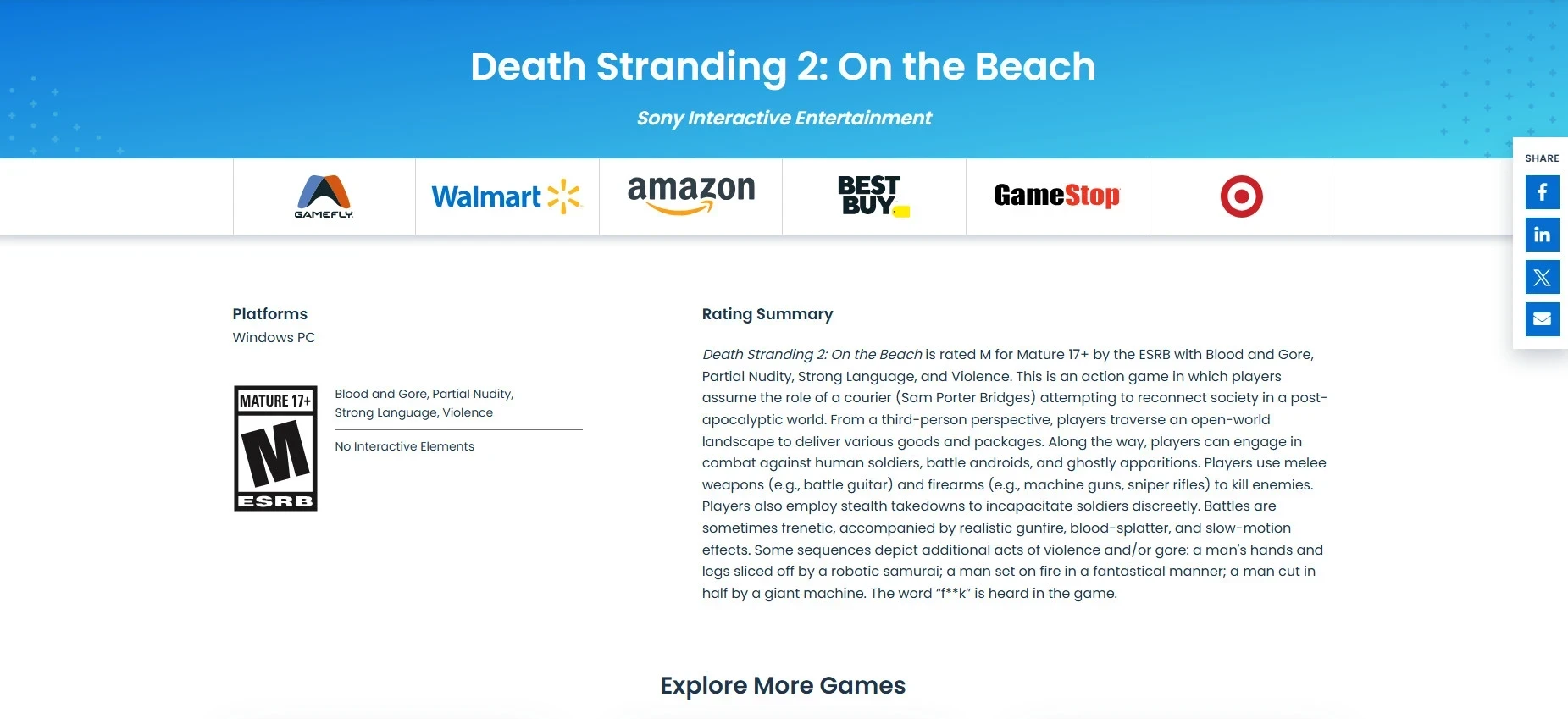 Рейтинг М (только для взрослых) соответствует версии для PlayStation 5. В приключениях Сэма Бриджеса можно увидеть частично обнажённых персонажей, насилие и кровь, сжигание заживо и расчленения. Не обошлось и без нецензурной брани. Информацию о возможном окне релиза компьютерного порта в ESRB не предоставили.