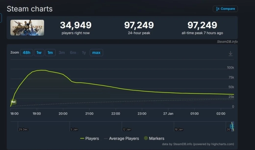 Что до пикового онлайна, то он достиг 97 249 игроков одновременно — это было 7 часов назад. На момент написания в шутере находятся 34 949 игроков одновременно.