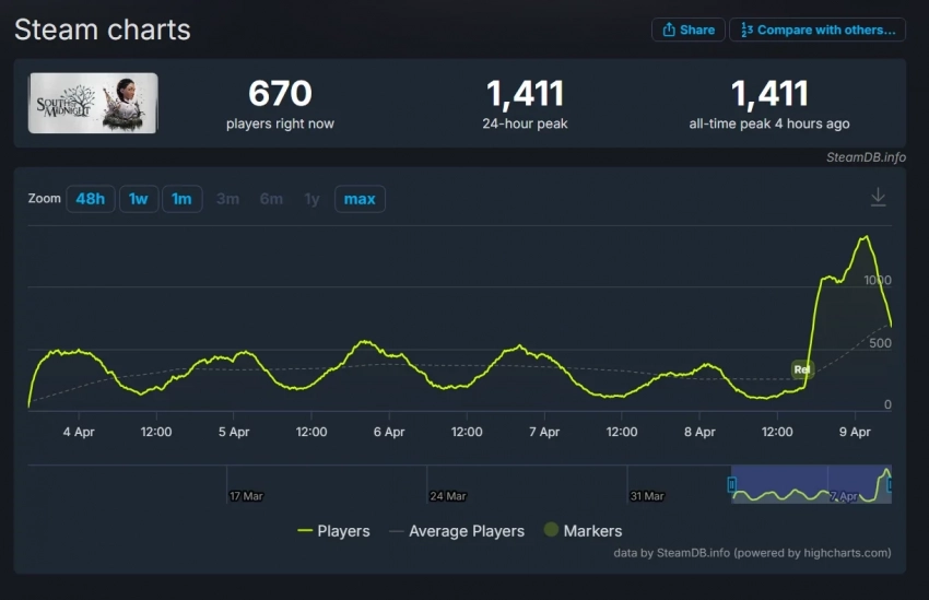 На старте пиковый онлайн экшен составлял чуть больше 500 человек одновременно. Сейчас он уже подрос — до 1 411 игроков. Но это очень мало.