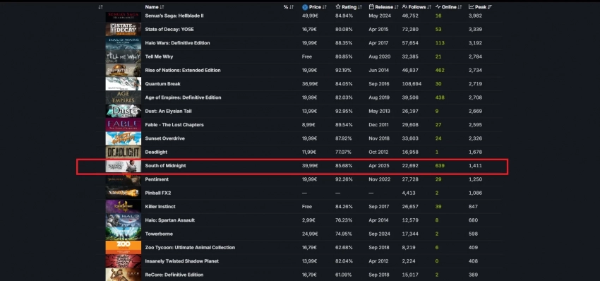 В общем топе релизов Xbox в Steam пиковый онлайн South of Midnight обошёл нишевую Pentiment (1 250) и Pinball FX2 (1 086).