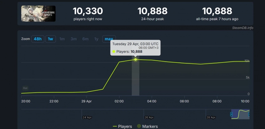 Пиковый онлайн почти достиг отметки в 10,9 тысячи человек. В момент написания новости в Wuthering Waves в Steam также находится более десяти тысяч человек, которых наверняка привлекло свежее обновление.