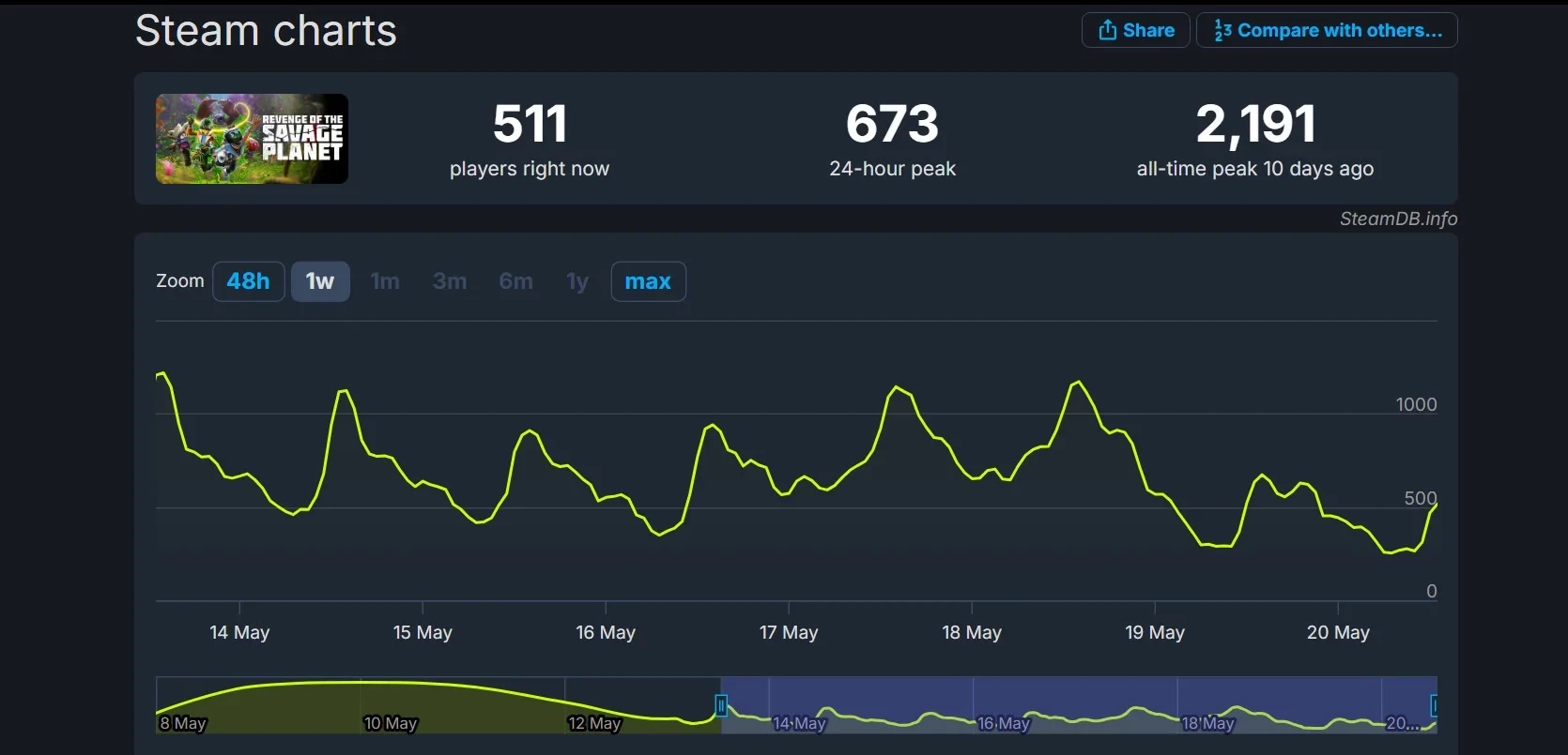 Если говорить про пиковый онлайн, то он почти достиг отметки в 2,2 тысячи человек. При этом ежедневно игре удаётся достигать суточного пика более 500 человек.