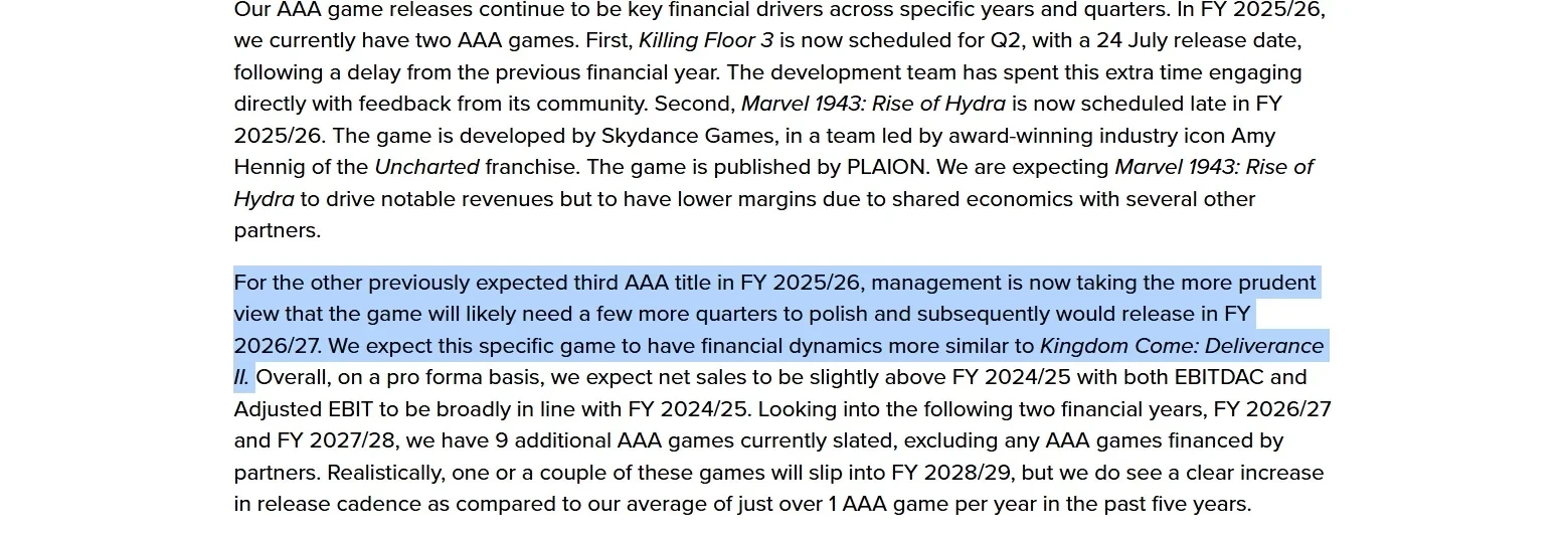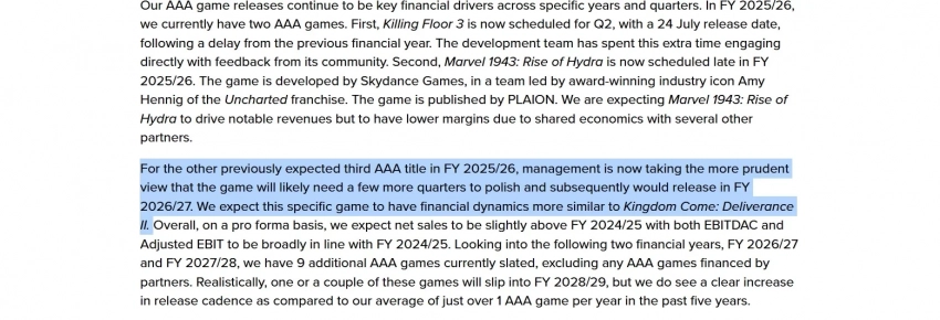 Что до перенесённой AAA-игры, то от неё ожидают финансовых успехов на уровне Kingdom Come: Deliverance 2. Последнюю купили более 3 млн раз, а на днях она получила дополнение Brushes with Death.