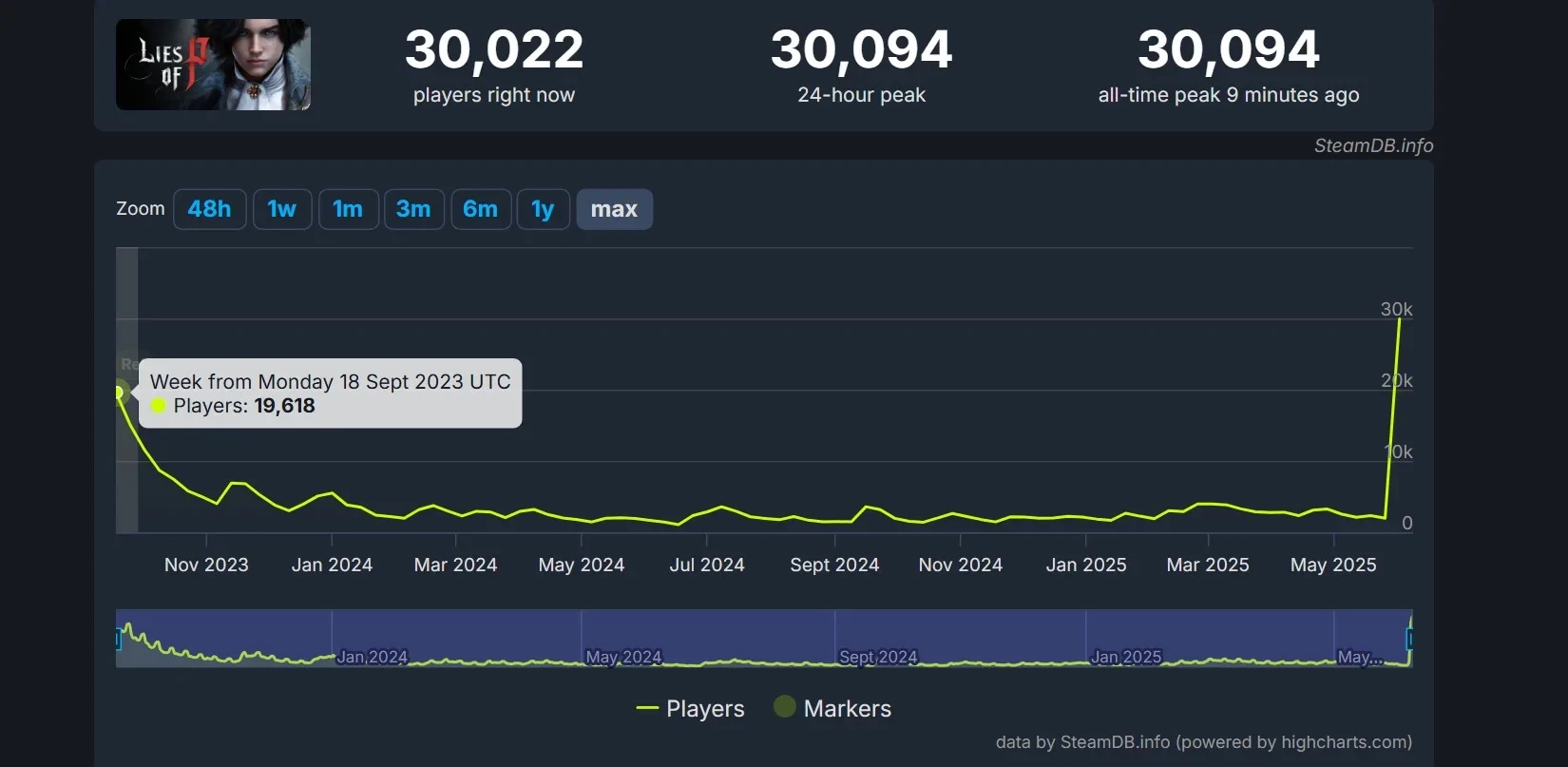 В момент написания новости в Lies of P находится более 30 тысяч человек. Плавный рост начался ещё 7 июня, однако ближе к вечеру выходных игра обновила свой рекорд. Ранее на пике в экшене находилось лишь 19,6 тысячи человек — это было 18 сентября 2023 года, в первые часы после выхода игры.