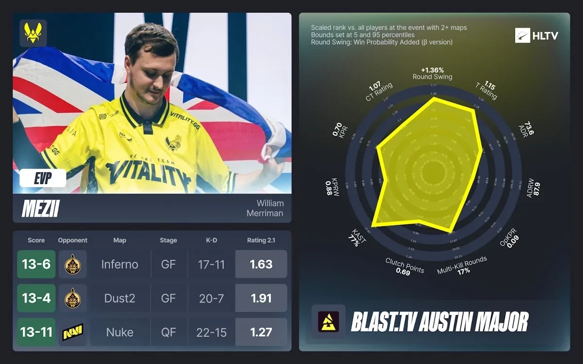 Уильям «mezii» Мерриман из Великобритании, получивший похвалу от apEX, также завоевал свой первый EVP в этом году. Его выдающаяся игра в гранд-финале помогла Vitality выйти из сложной ситуации и одержать победу.