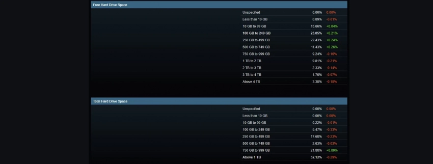 Что продолжает падать, так это свободное место. У большинства пользователей Steam (23,05%) в июне было свободно от 100 до 249 ГБ — показатель увеличился на 0,21%. А у целых 15% геймеров и вовсе свободно от 10 до 99 ГБ. Для сравнения, от 1 до 2 ТБ свободного пространства есть лишь у 9,81% игроков.