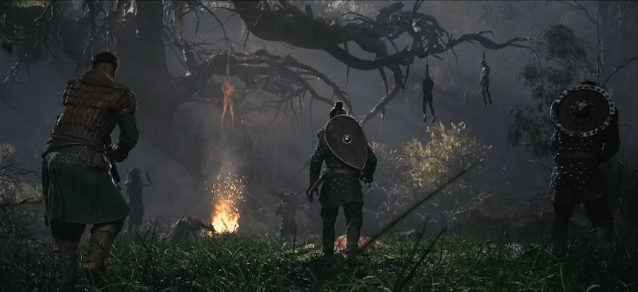На фоне рассказа показаны всадники, добирающиеся до раскидистого дерева, возле которого молятся язычники и приносят жертвы. Авторы игры показали сражение с этими самими язычниками.