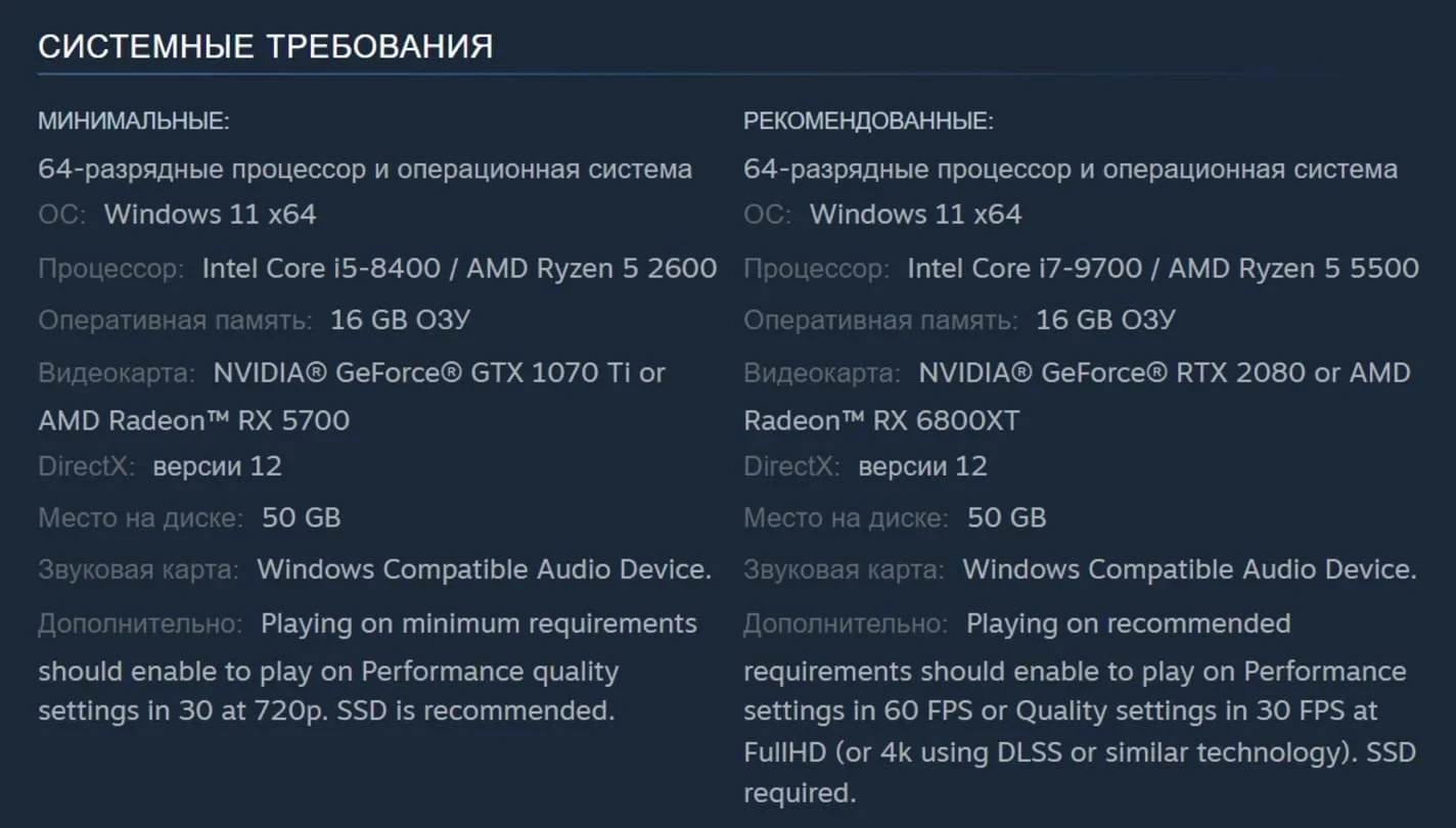 К слову, у игры уже известны системные требования, а ее размер на диске составит 50 ГБ. Ознакомиться с ними можно ниже.