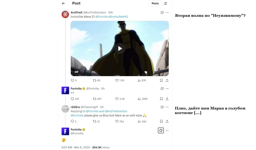 Многие также обратили внимание на официальный аккаунт Fortnite в X, который оставил, хоть и не прямой, но очень многообещающий комментарий на тему новой косметики по «Неуязвимому».