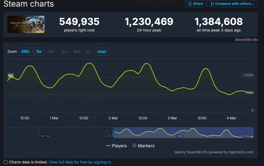 Успех новинки подчеркивает и огромный онлайн в Steam, который в пике перевалил за 1,3 млн игроков. На данный момент в MH: Wilds находится почти 550 тысяч человек.