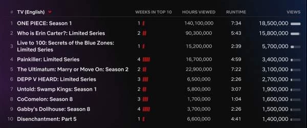 Netflix обнародовал обновленную статистику просмотров своих фильмов и сериалов за период с 28 августа по 3 сентября. Из свежих данных стало известно, что адаптацию One Piece за первые четыре дня после премьеры посмотрели 18.5 млн раз.