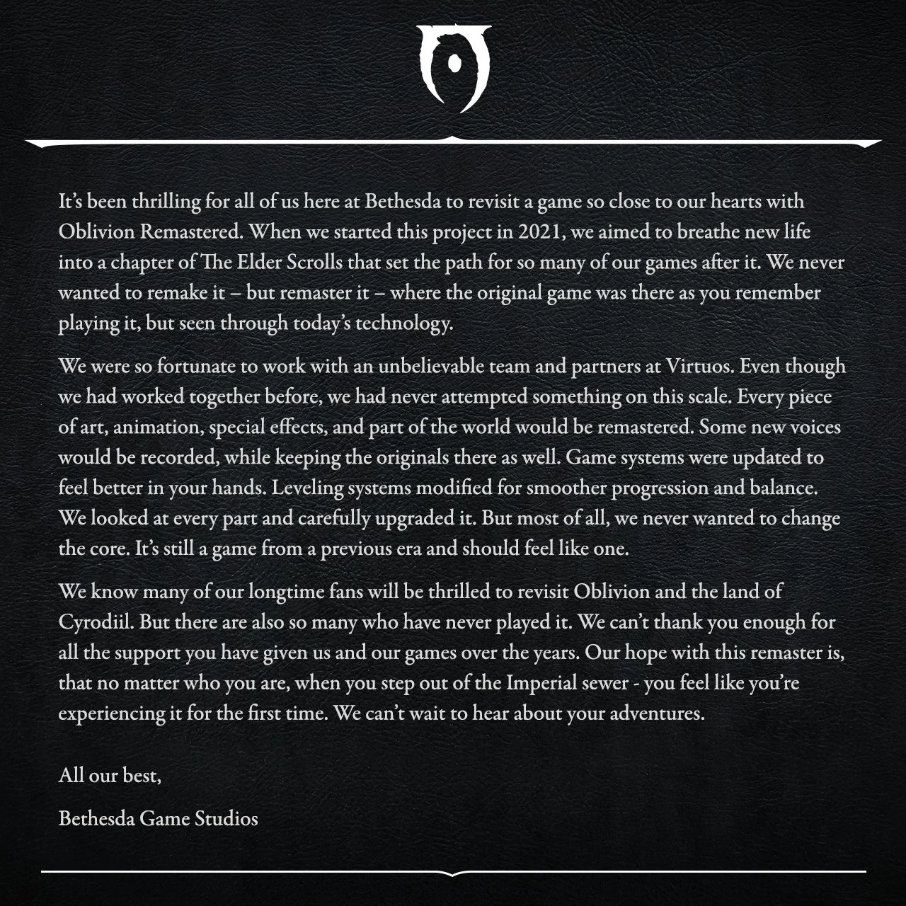 Как заявила Bethesda, работа над проектом началась в 2021 году, и с самого начала разработчики хотели вдохнуть новую жизнь в важную для серии главу. Однако они никогда не хотели переделывать её — лишь обновить, чтобы игра оставалась такой, какой её помнят поклонники.