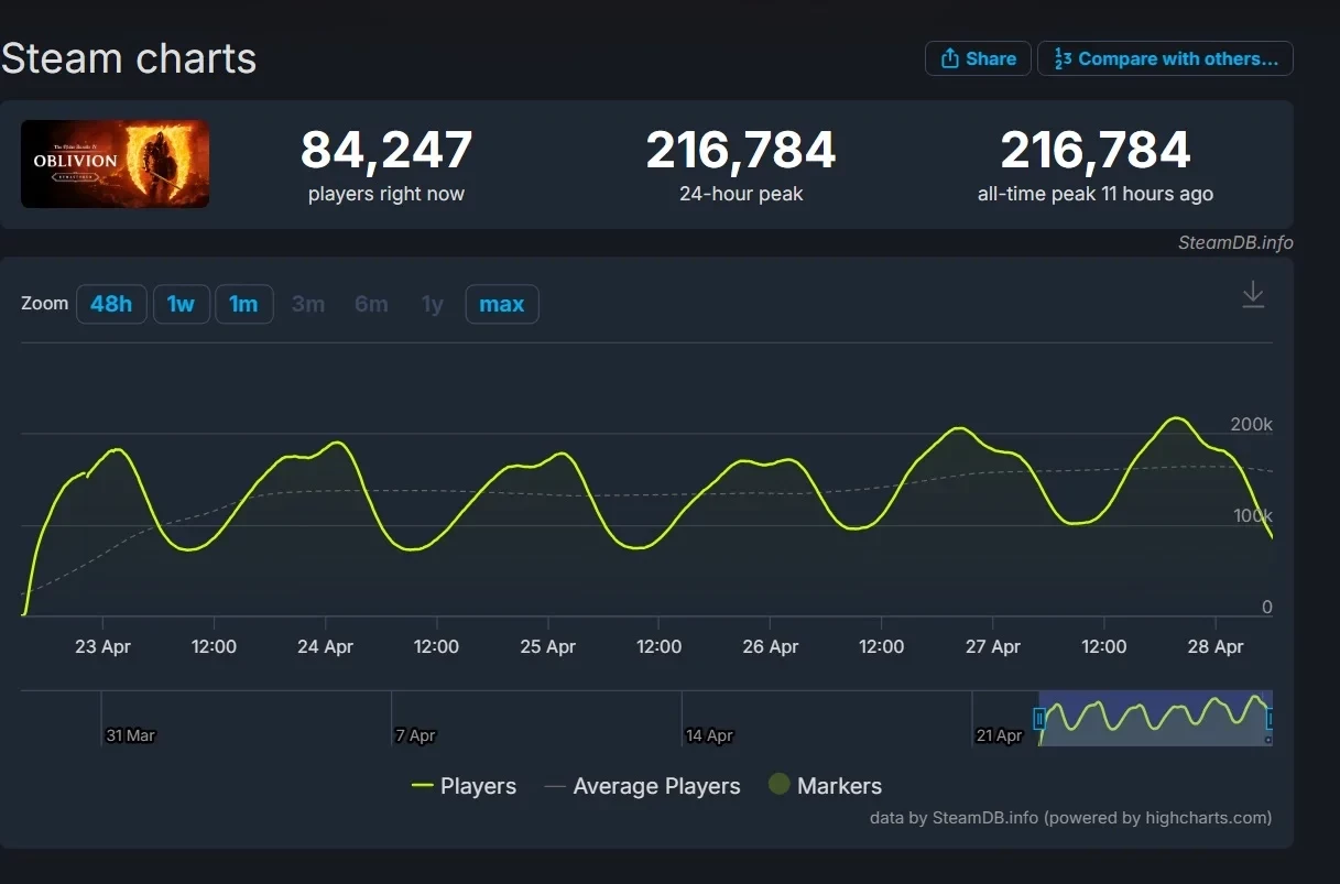 The Elder Scrolls 4: Oblivion Remastered доступна на PC, Xbox Series и в Game Pass. Её пиковый онлайн в Steam превысил 216 тыс игроков.