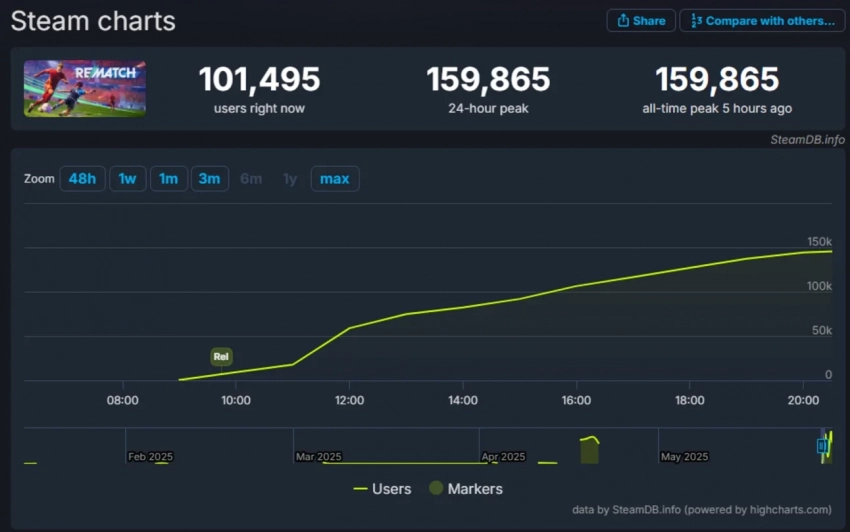 Ещё больше интересных видео на YouTube канале Игромании!Обложка: скриншот RematchФутбольный кооперативный экшен Rematch от создателей Sifu привлёк более 159 тысяч одновременных игроков в Steam во время открытого бета-тестирования. Оно также проходит на консолях PS5 и Xbox Series X, но точные данные по этим платформам отсутствуют.