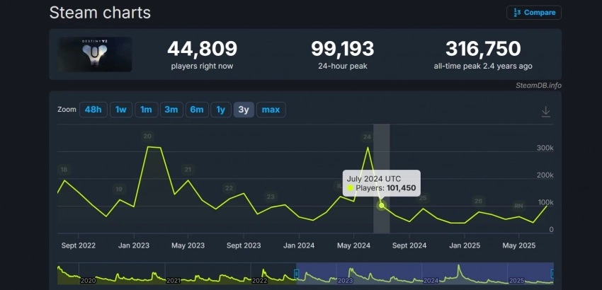 Также дополнение The Edge of Fate смогло вызвать всплеск аудитории Destiny 2. На пике в Steam за последние сутки в шутере находилось более 99 тысяч игроков. В последний раз подобный онлайн наблюдался год назад.